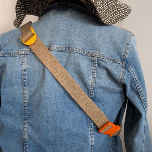 – la sangle marron claire et dorée est réglable de 62 cm à 98cm avec des boucles de réglages orange et jaune en plastique.