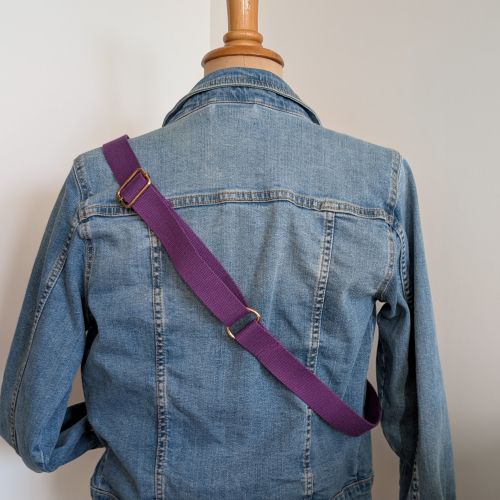 – la sangle violette est réglable de 72 cm à 93 cm avec une boucle de réglage dorée.