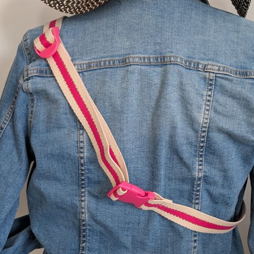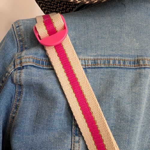 – la sangle beige/rose/dorée est réglable de 72 cm à 95 cm avec des boucles de réglages roses fushia en plastique.