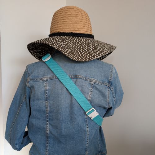 – la sangle couleur vert d’eau est réglable de 59 cm à 85 cm avec des boucles de réglages blanche en plastique.