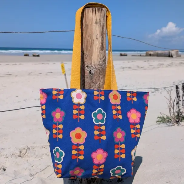 – extérieur: coton épais bleu avec grosses fleurs moutarde/rose/vert/orange