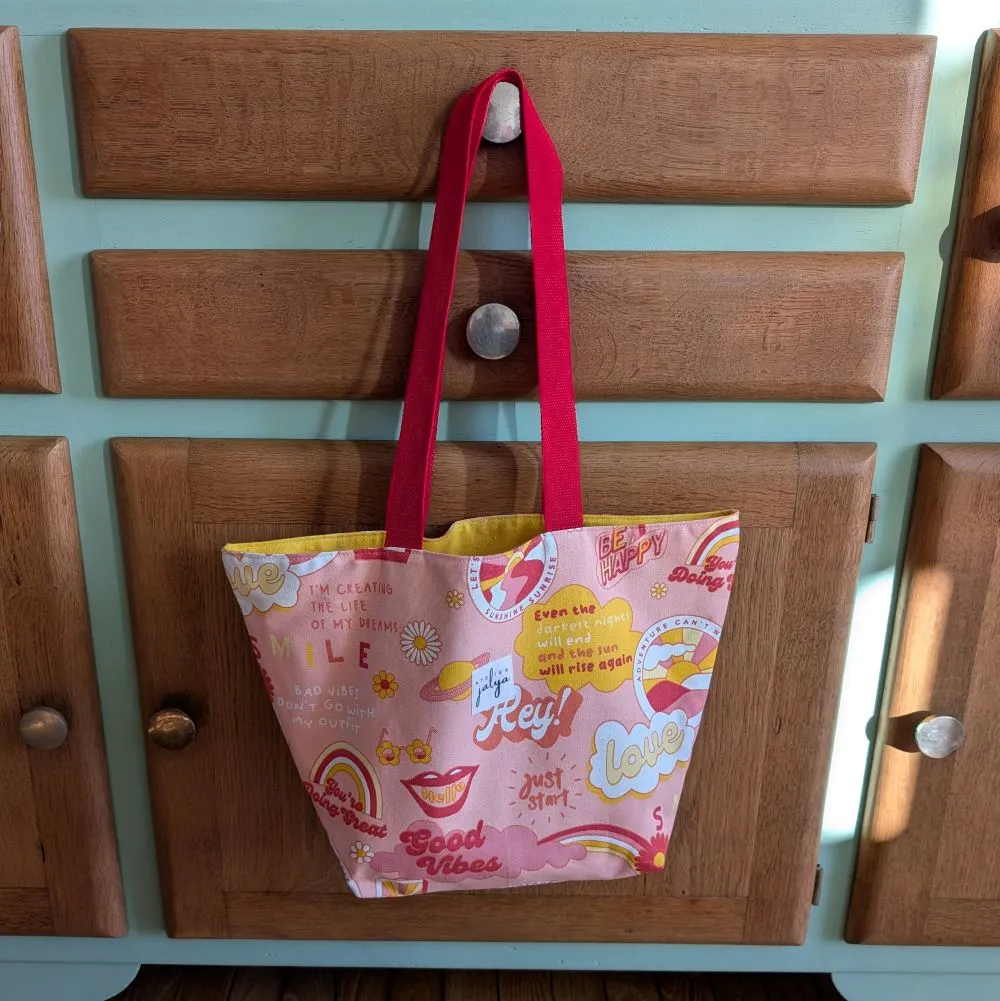 – extérieur: coton épais aux motifs rétro Pop up jaune et rouge sur fond rose clair